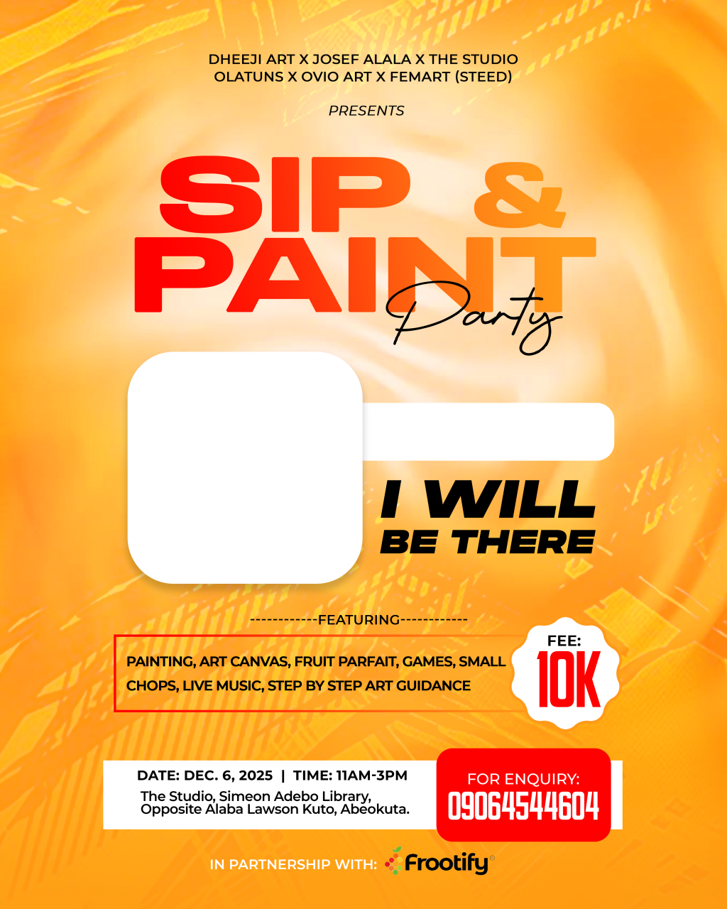 Painting, art canvas, fruit parfait, games, small chops, Live music, step by step art guidance