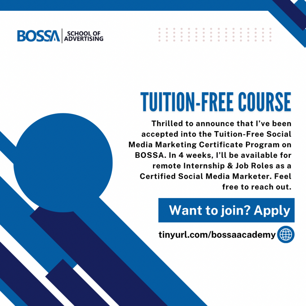 Thrilled to announce that I’ve been accepted into the Tuition-Free Social Media Marketing Certificate Program  on BOSSA. In 4 weeks, I’ll be available for remote Internship & Job Roles as a Certified Social Media Marketer. Feel free to reach out. If you're interested in joining the next cohort, go to:  www.betteroffservice.com/bossaacademy