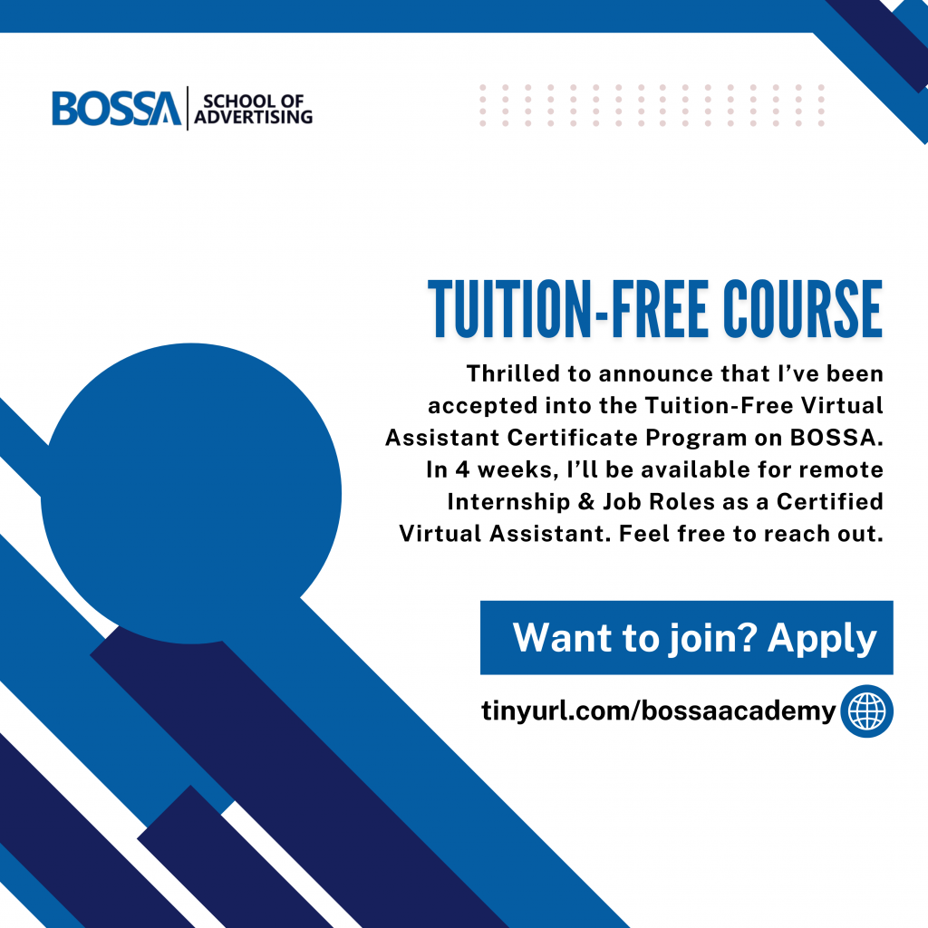 Thrilled to announce that I’ve been accepted into the Tuition-Free Virtual Assistant Certificate Program on BOSSA. In 4 weeks, I’ll be available for Job Roles as a Certified Virtual Assistant. Feel free to reach out. If you're interested in joining the next cohort, go to: www.betteroffservice.com/bossaacademy
