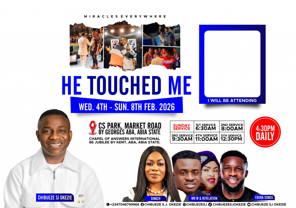 He touched me is a global annual healing and deliverance meeting. Held in the city of Aba, Abia State, Nigeria. Divers testimonies, healings and deliverances has sprung up from this HolyGhost meeting over the years, and it has been from glory to glory. He Touched Me is packaged by God to bring the miraculous to everyone in attendance including online worshippers through God's vessel Chibueze S.J. Okezie. Get set for a touch!