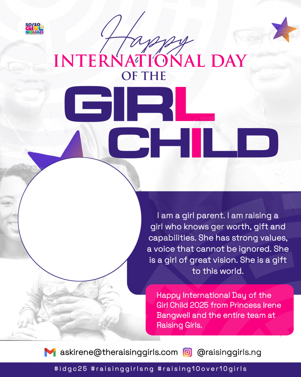 I am a girl parent. I am raising a girl who knows ger worth, gift and capabilities. She has strong values, a voice that cannot be ignored. She is a girl of great vision. She is a gift to this world. Happy International Day of the Girl Child 2025 from Princess Irene Bangwell and the entire team at Raising Girls.