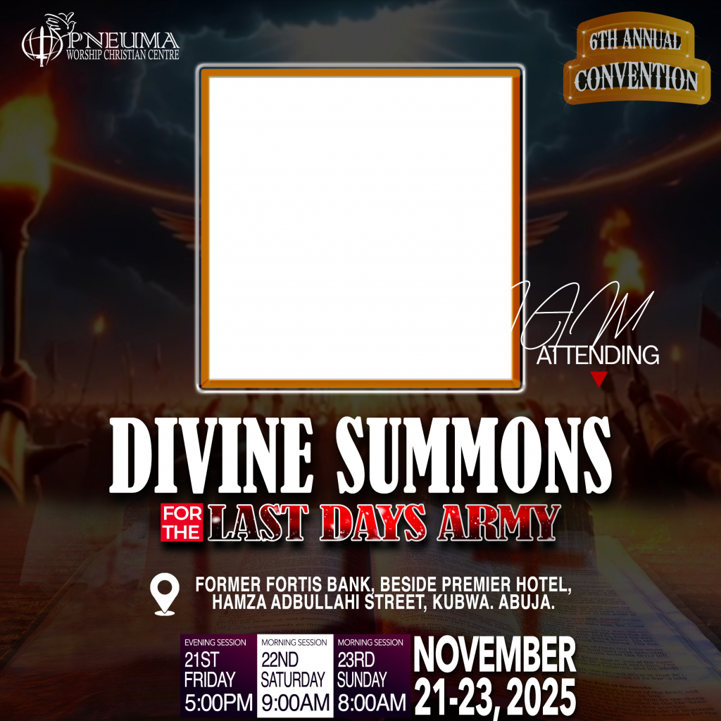 The 6th Annual Convention of Pneuma Worship Christian Centre, Kubwa. Abuja. Theme: DIVINE SUMMONS For The LAST DAYS ARMY. Date: 21st to 23rd...